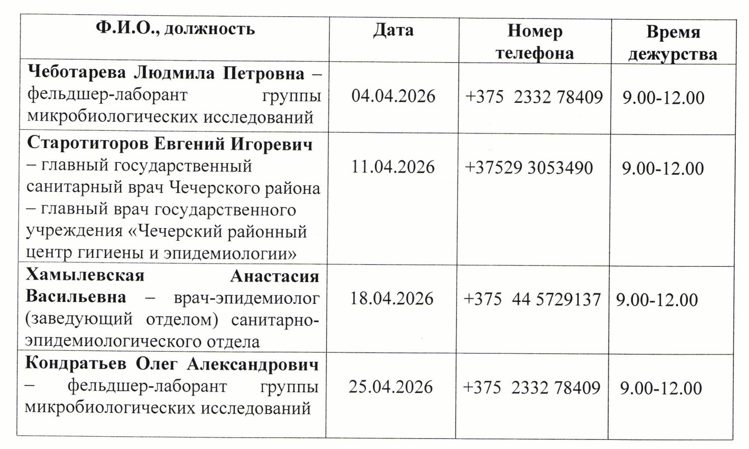 - Прием заявителей в государственном учреждении «Чечерский районный центр гигиены и эпидемиологии» осуществляется первая среда месяца с 8.00 до 13.00 в соответствии с утверждённым графиком личного приёма.